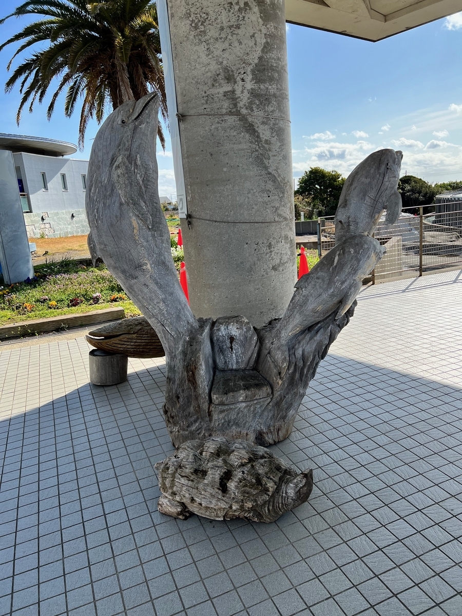 木彫りのイルカやカメ、クジラです。すごく精巧によくできてるんですが、設置されてる場所が場所だけにかなり褪せてしまっていました。